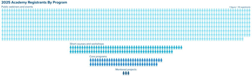 Throughout 2025, a record 10,500 people registered for our trainings, entering our programming “funnel,” from our free, public webinars to short courses and workshops, our core programs, and policy projects developed under Academy mentorship.